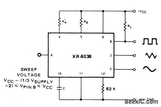 Frekuensi generator gelombang merupakan fungsi langsung dari tegangan DC di Terminal 8 (diukur dari V +). Dengan mengubah tegangan ini, modulasi frekuensi dilakukan. Untuk penyimpangan kecil (misalnya ± 10%) sinyal modulasi dapat diterapkan langsung ke pin 8, hanya menyediakan decoupling DC dengan kapasitor seperti yang ditunjukkan pada Gambar 5A. Sebuah resistor eksternal antara pin 7 dan 8 adalah tidak perlu, tetapi dapat digunakan untuk meningkatkan masukan impedansi dari sekitar 8kΩ (pin 7 dan 8 dihubungkan bersama-sama), menjadi sekitar (R + 8kΩ). Untuk penyimpangan FM lebih besar atau untuk frekuensi menyapu, maka modulasi sinyal diterapkan antara suplai positif tegangan dan pin 8 (Gambar 5B). Dengan cara ini bias keseluruhan untuk sumber saat ini diciptakan oleh sinyal modulasi, dan kisaran (misalnya 1000:1) menyapu sangat besar dibuat (F = Minimum di VSWEEP = 0, yaitu, Pin 8 = V +). Perawatan harus diambil, namun, untuk mengatur tegangan suplai; dalam hal ini konfigurasi muatan saat ini tidak lagi menjadi fungsi suplai tegangan (namun ambang pemicu masih) dan dengan demikian frekuensi menjadi tergantung pada tegangan suplai. Potensi pada Pin 8 dapat menyapu turun dari V + oleh (1 / 3 VSUPPLY - 2V).